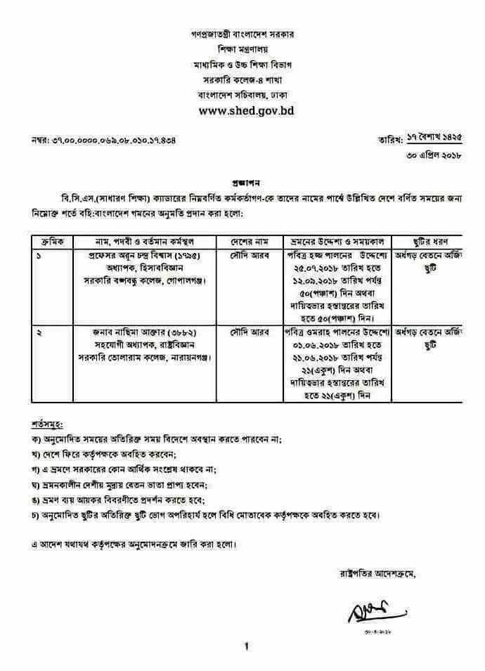 বিসিএস শিক্ষা ক্যাডারের সনাতন ধর্মাবলম্বী এক শিক্ষককে ৫০ দিনের ছুটি মঞ্জুর করা হয়েছে হজে যাওয়ার জন্য। তিনি গোপালগঞ্জের সরকারি বঙ্গবন্ধু কলেজের হিসাববিজ্ঞান বিভাগের শিক্ষক অধ্যাপক অরুণ চন্দ্র বিশ্বাস। গত সোমবার শিক্ষা মন্ত্রণালয় থেকে এই অদ্ভুত আদেশ জারি করা হয়েছে।